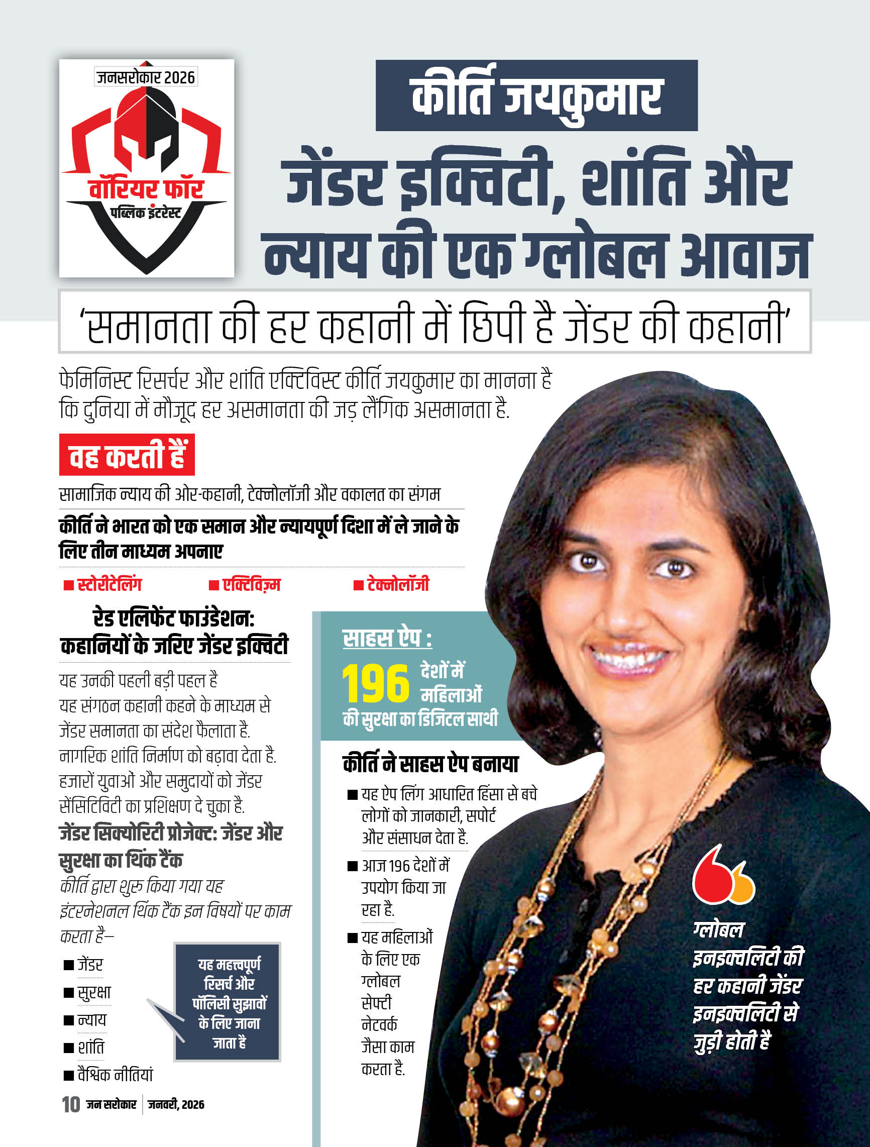 Share Facebook Twitter LinkedIn Pinterest Email Telegram WhatsApp Copy Link ‘समानता की हर कहानी में छिपी है जेंडर की कहानी’ फेमिनिस्ट रिसर्चर और शांति एक्टिविस्ट कीर्ति जयकुमार का मानना है कि दुनिया में मौजूद हर असमानता की जड़ लैंगिक असमानता है.