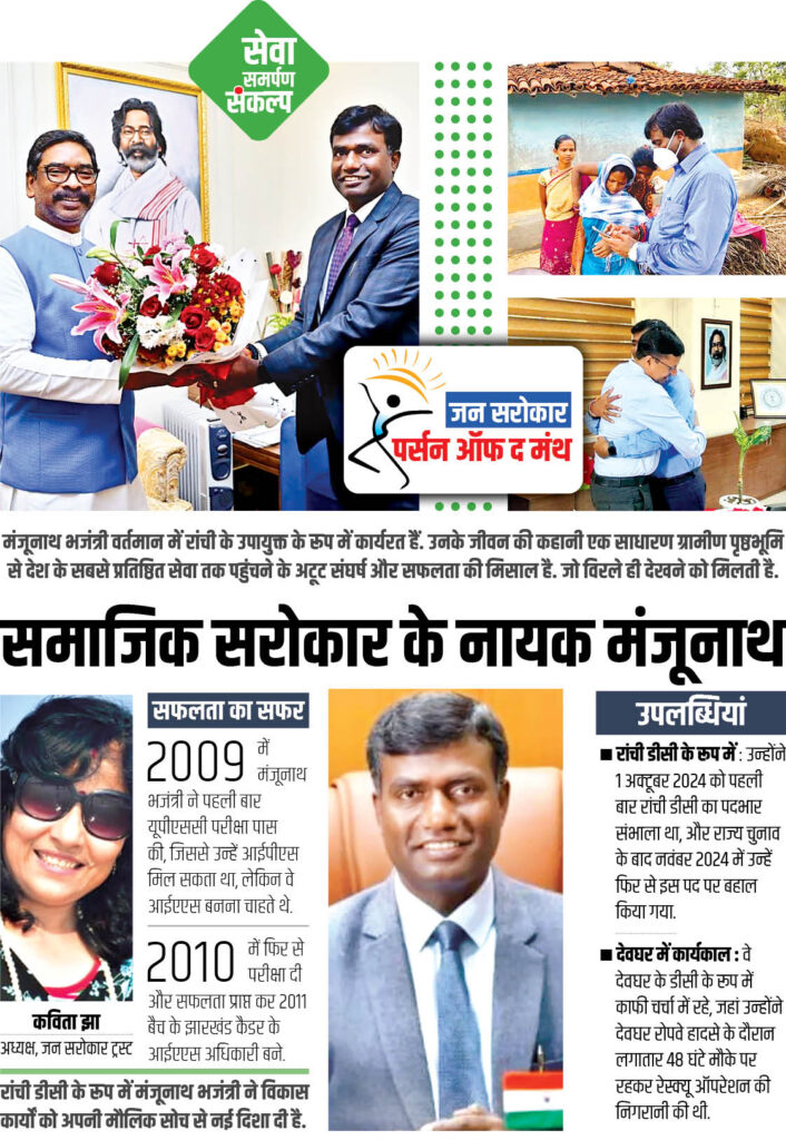 Share Facebook Twitter LinkedIn Pinterest Email Telegram WhatsApp Copy Link मंजूनाथ भजंत्री वर्तमान में रांची के उपायुक्त के रूप में कार्यरत हैं. उनके जीवन की कहानी एक साधारण ग्रामीण पृष्ठभूमि से देश के सबसे प्रतिष्ठित सेवा तक पहुंचने के अटूट संघर्ष और सफलता की मिसाल है. जो विरले ही देखने को मिलती है.