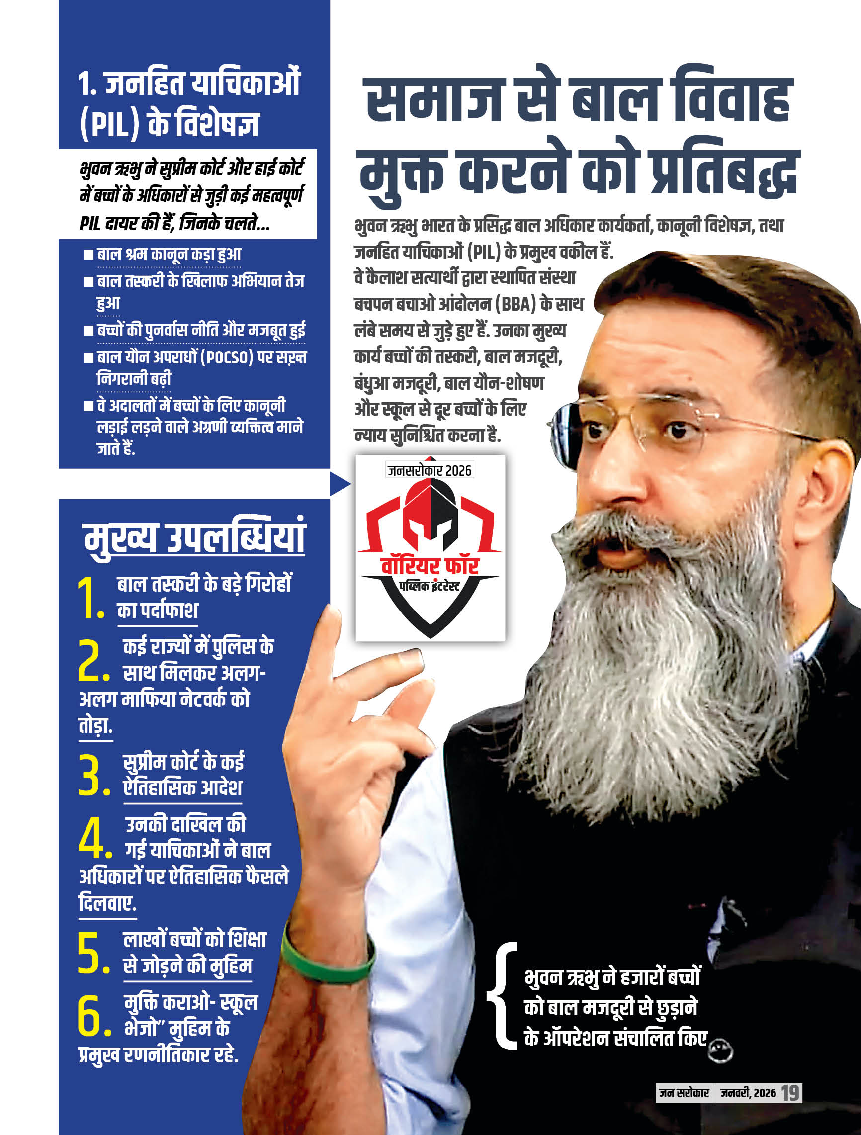 भुवन ऋभु भारत के प्रसिद्ध बाल अधिकार कार्यकर्ता, कानूनी विशेषज्ञ, तथा जनहित याचिकाओं (PIL) के प्रमुख वकील हैं. वे कैलाश सत्यार्थी द्वारा स्थापित संस्था बचपन बचाओ आंदोलन (BBA) के साथ लंबे समय से जुड़े हुए हैं. उनका मुख्य कार्य बच्चों की तस्करी, बाल मजदूरी, बंधुआ मजदूरी, बाल यौन-शोषण और स्कूल से दूर बच्चों के लिए न्याय सुनिश्चित करना है.